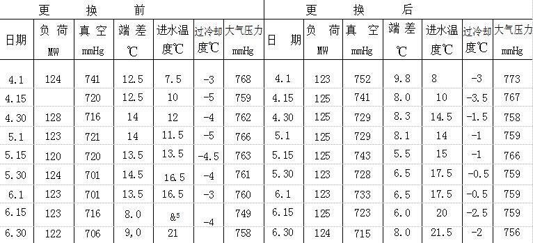 2、每臺(tái)機(jī)每?jī)商爝M(jìn)行一次膠球清洗,每次投入300個(gè)膠球,清洗1小時(shí),收球半小時(shí)。經(jīng)過(guò)兩年的實(shí)踐,證明14FH-5-0凈水器和S-14-0收球網(wǎng)操作方便、除污性強(qiáng)、耐海水腐蝕、收球率在95%以上、對(duì)凝汽器冷卻管保護(hù)膜沒(méi)有損壞、減輕了檢修人員的勞動(dòng)。凝汽器各項(xiàng)經(jīng)濟(jì)指標(biāo)大有好轉(zhuǎn),經(jīng)濟(jì)效益顯著提高。以1號(hào)機(jī)為例,更換前、后每月抽出三天,以每天上午9點(diǎn)鐘的運(yùn)行參數(shù)進(jìn)行同期比較,見(jiàn)附表.