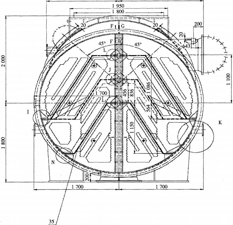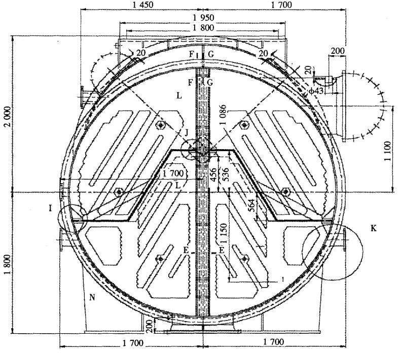 圖1小機凝汽器水室隔板改造前示意圖(單位:mm)進行調研分析。通過現場檢查,認為造成收球率較低的主要原因有以下幾點:
