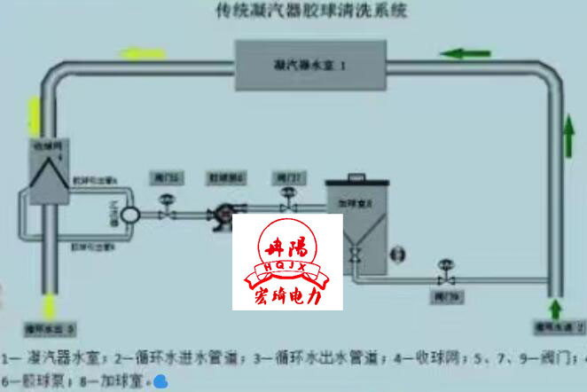 熱水進入循環水出水管道。發球過程中,膠球從集中發球裝置集中發送→循環水進水管道→凝汽器水室入口→凝汽器水室出口→收球網+集中發球裝置。可增設后水室發球點。