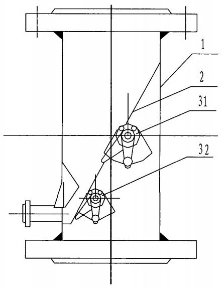 膠球清洗裝置參見圖1,圖1是實施例的主視圖,包括:安裝在主體1側(cè)壁上的柵板轉(zhuǎn)動裝置31和柵板鎖緊裝置32和安裝在主體1內(nèi)的柵板2。柵板2的示意圖可參見該設(shè)備的俯視圖圖3,圖2為實施例中設(shè)備的左視圖,柵板轉(zhuǎn)動裝置31包括:通過螺栓8固定在主體1側(cè)壁上的定位板14,定位板14的通孔中安裝有軸10,手柄15通過螺絲11固定在軸10上,當手柄15轉(zhuǎn)動時,帶動軸10旋轉(zhuǎn),軸10帶動主體1內(nèi)的柵板閉合或開啟,如圖3所示。